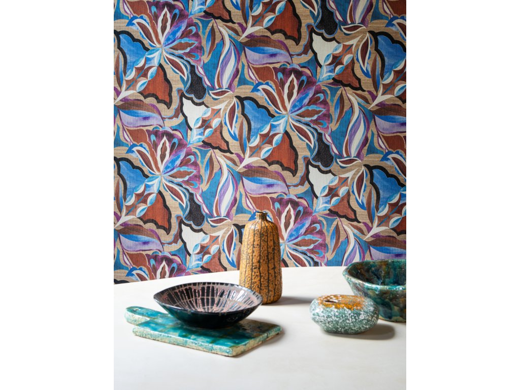 Textilní tapeta s abstraktním, tropickým potiskem, který dodává pocit skutečné intarzie. Když se podíváte pozorně, můžete vidět texturu tkaných trav v pozadí. Akvarelový efekt propůjčuje exotickým květinám jemný dotek.