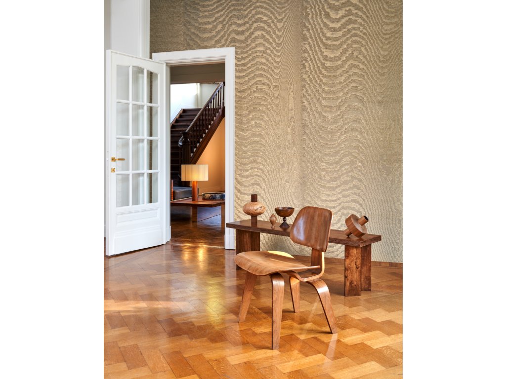 Oslepující paprsky slunce na vodě a pouštním písku mají za následek zvlněné, hypnotické vzory a vytvářejí na lesklé látce moaré efekt. Motivy jsou zcela náhodné, díky čemuž je každá tapeta jedinečná.