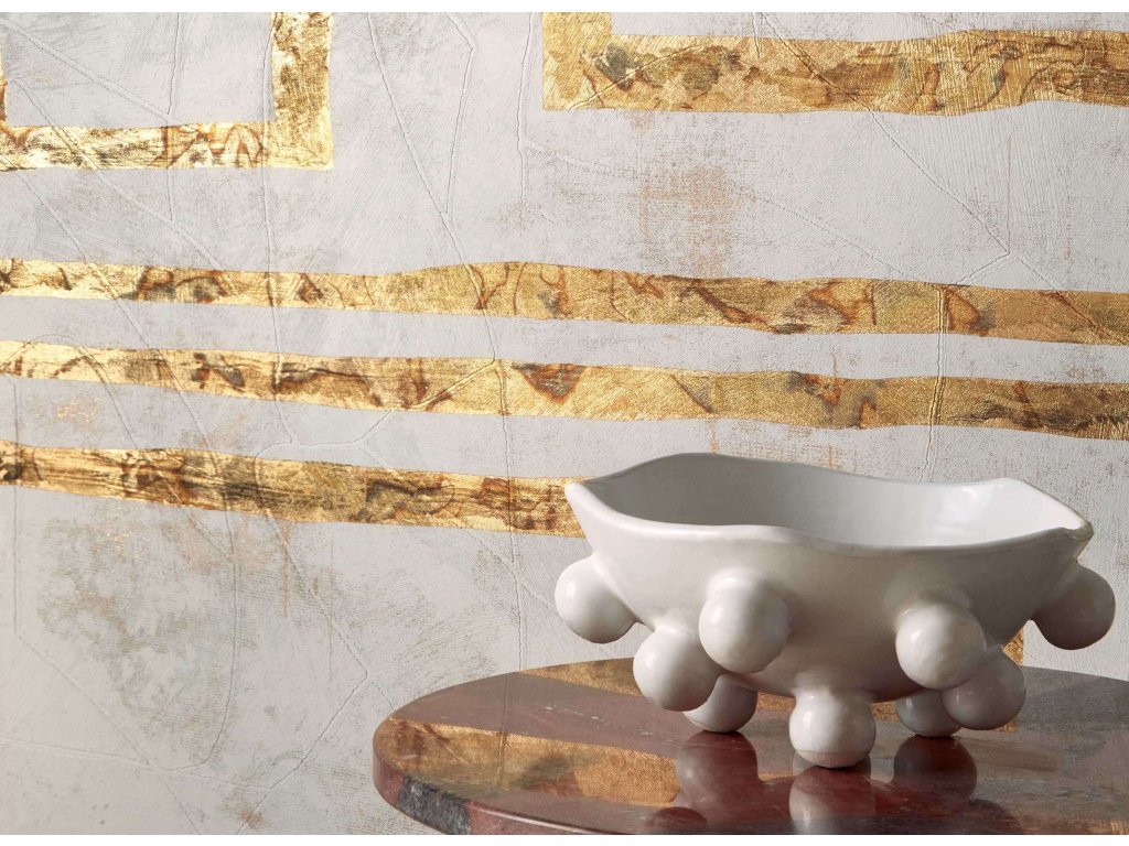 Tapeta je ozdobena plátkovým zlatem.