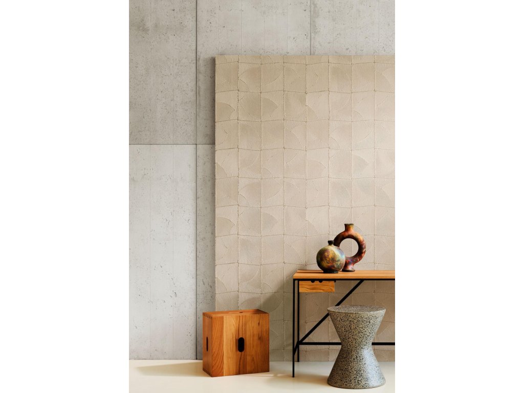 Tapeta s organickými tvary. Nitě z různých materiálů a tlouštěk jsou pečlivě ručně umístěny do vzorů a vytvářejí minimalistický design s odpovídajícím reliéfem.